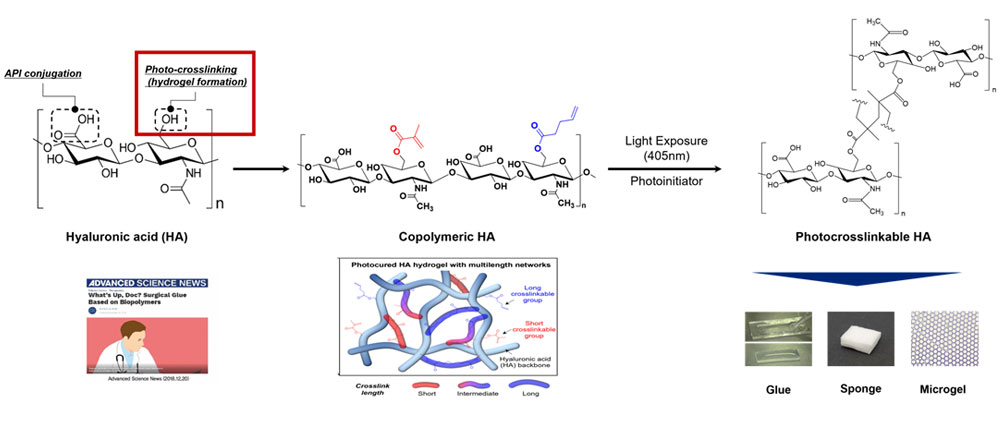 HAMAPA는 저출력 가시광선에서도 수 초(second)내 가교반응을 유도할 수 있으므로 연구의 효율성 향상에 기여할 수 있습니다. 또한 경화된 후에도 강도 및 신축성과 같은 기계적인 물성이 우수한 하이드로겔을 형성하며, 생체적합성도 우수한 새로운 공중합형 광가교 소재입니다.